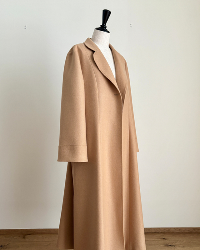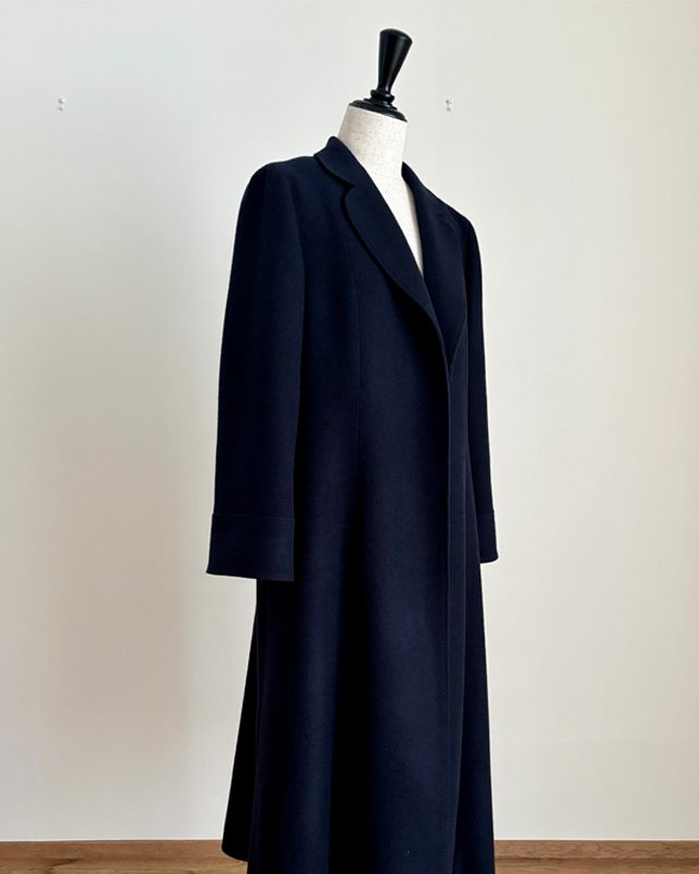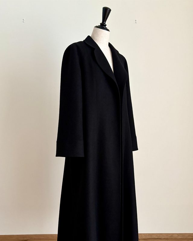 肩の力を抜いたドロップショルダーと、流れるようなロングシ